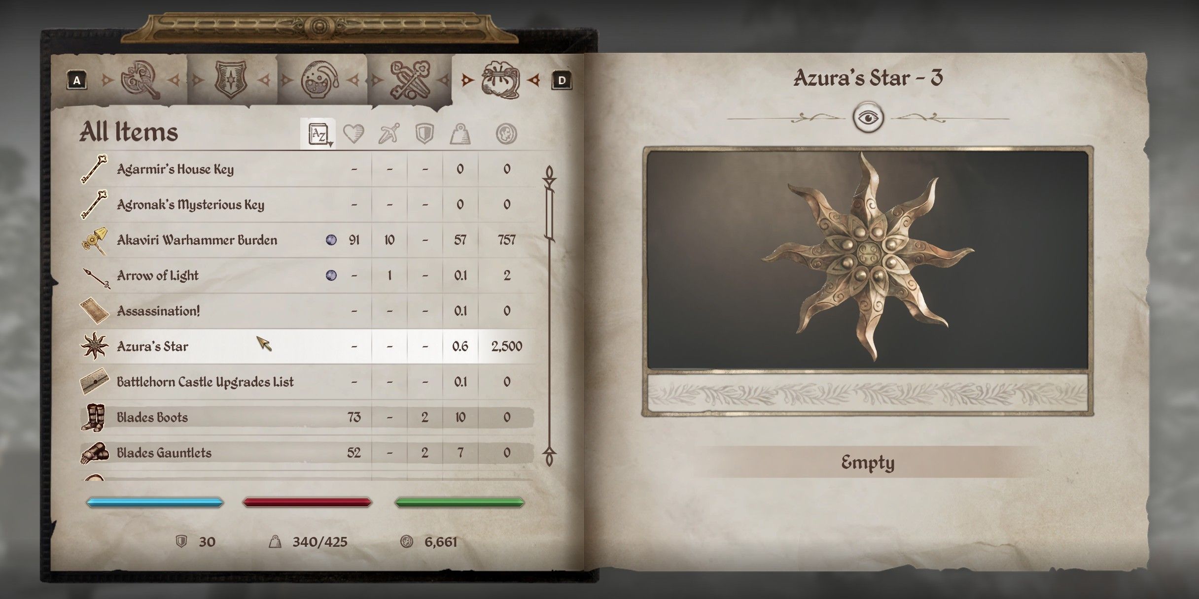 A maioria das gemas de alma desaparece após o uso, mas não a Estrela de Azura. Este item pode ser adquirido de forma muito precoce, possivelmente logo após sair da prisão imperial, já que a quest exige um personagem no nível 2. O jogador precisa oferecer um pouco de pó brilhante a Azura ao amanhecer ou ao entardecer, e então é encarregado de eliminar antigos adoradores que estão presos na Mina Despedaçada. Esses adoradores contraíram vampirismo, o que pode resultar em complicações adicionais durante a missão.